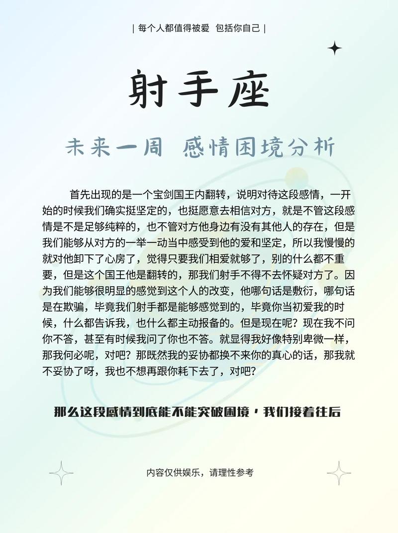 对于已经有伴侣的射手座而言,九月可能会带来一些情感上的考验。你们可能会感受到来自伴侣的压力,或者在关系中遇到一些摩擦和误解。这并不是坏事,而是对你们关系的一次深度考验。通过沟通和理解,你们可以突破这些障碍,让感情更加稳固。在这个过程中,射手座的直率和诚实将会是你们解决问题的利器。