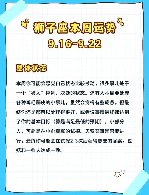 2. 保持活力:尽管狮子座精力旺盛,但长时间的压力可能会影响健康。适当的运动和放松是必要的,可以帮助缓解疲劳,保持良好的身体状态。