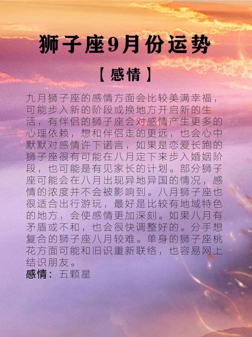 在这个充满机遇和挑战的月份,狮子座女生应以积极的姿态迎接职场上的一切变动,通过智慧和努力,将星辰的恩赐转化为实际的职业成就。九月注定将是你职业生涯中的一个重要节点,勇敢把握,成就辉煌未来。
