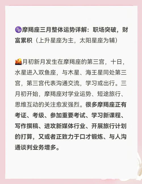 3月份,摩羯座的财运表现稳健中略带起伏。月初财务收支平衡,但月末会出现一些意外支出。把握住机会,理智投资,可为未来财务状况奠定坚实基础。