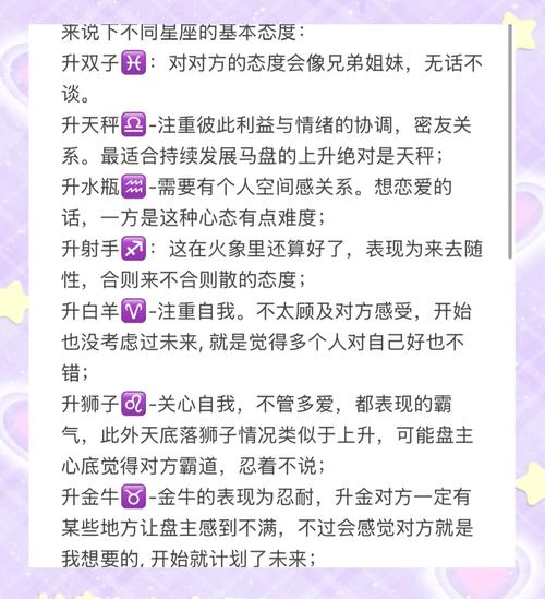 升星座,即“上升星座”,是出生时东方地平线上升起的星座。它通常被视为个体在社交场合中的外在表现,影响着一个人的气质、外貌以及第一印象。在情感方面,升星座也深刻地影响着一个人在性关系中的表现与态度。它不仅仅是星座学中的一种标识,更是深入个体内心世界的窗口。